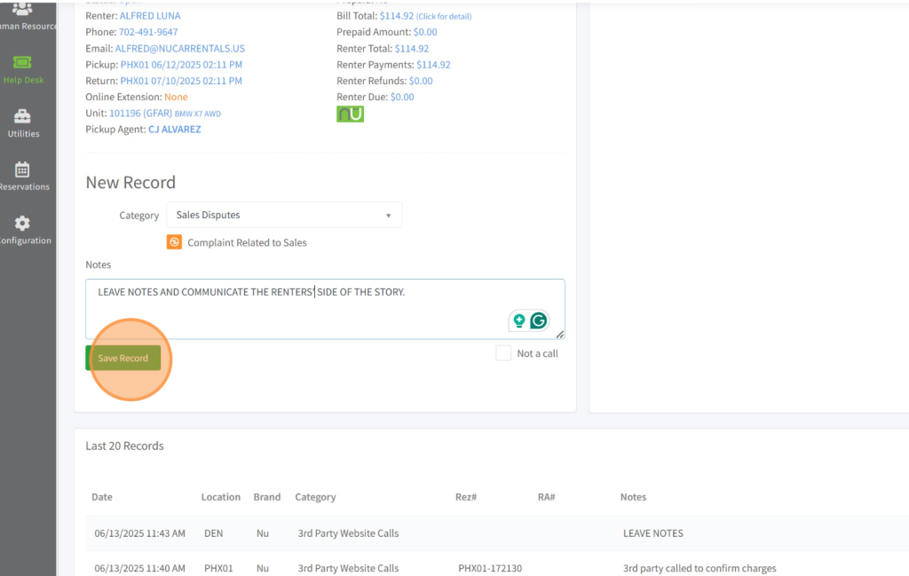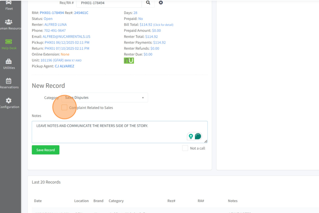 IMPORTANT: Make sure to click the box that says “Complaint Related to Sales” if there is any sort of Sales Disputes, regardless if we told the renter that the charges stands, or if it needs to be escalated for further review.
