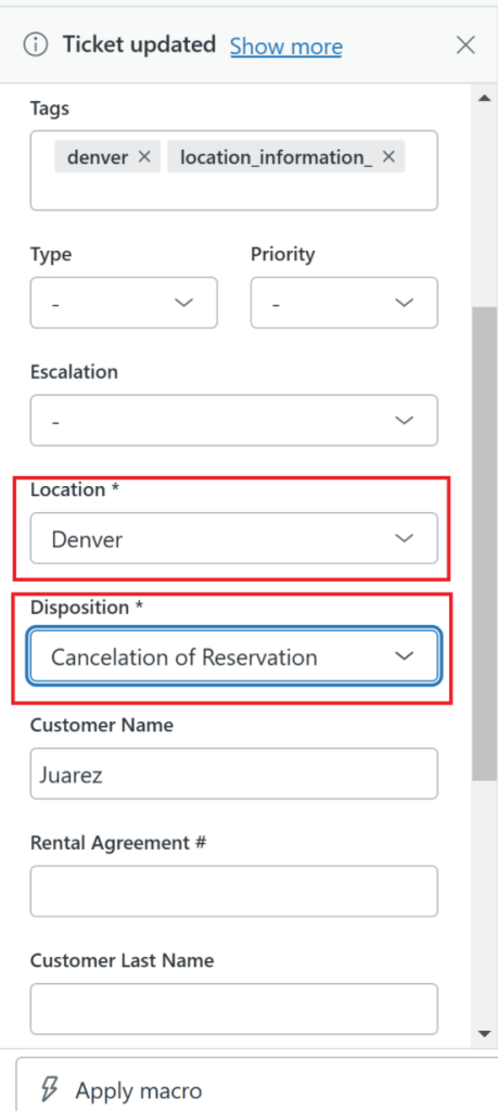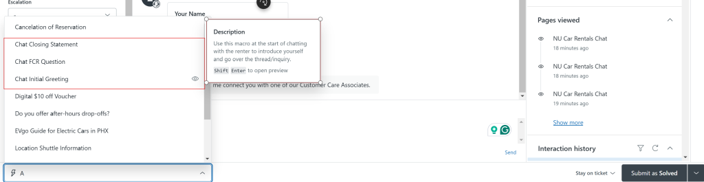 - Locate and apply the “Chat Initial Greeting” macro to the ticket.